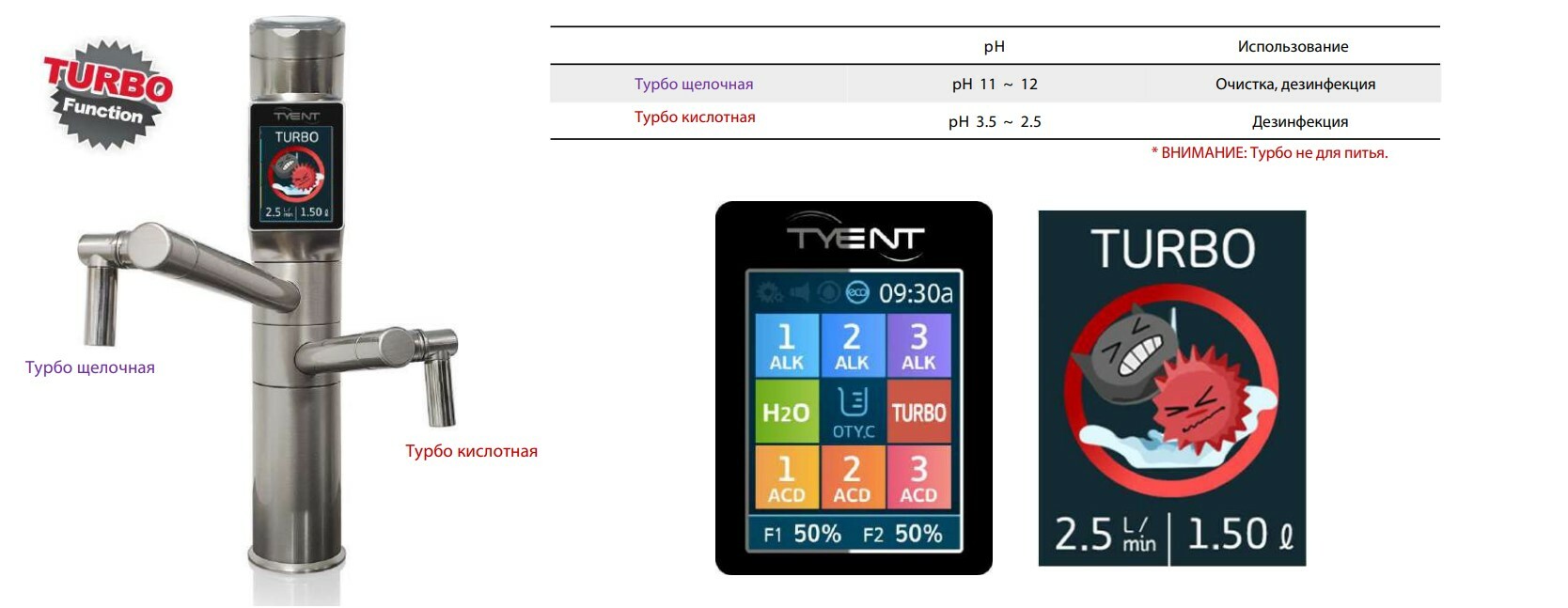 Функция «‎ТУРБО»‎ позволяет получать техническую воду: сильную щелочь или сильную кислоту для дезинфекции и очистки.