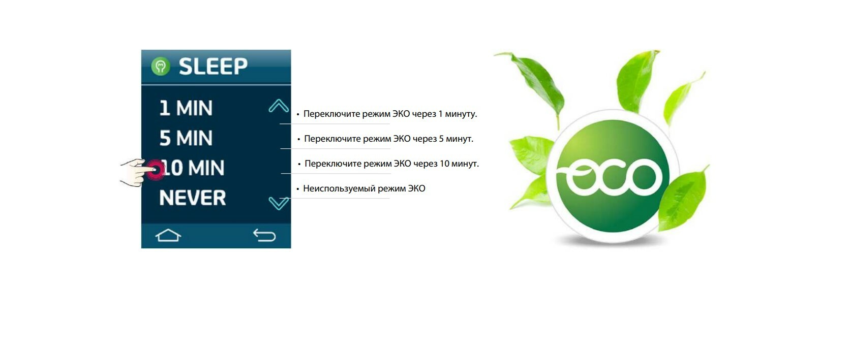 При настройке эко-режима подсветка ЖК-дисплея автоматически отключается в периоды его неиспользования и функция времени отображается. Экономьте энергию с помощью этой благоприятный по отношению к окружающей среде особенностью, которая отображает текущее время при активации