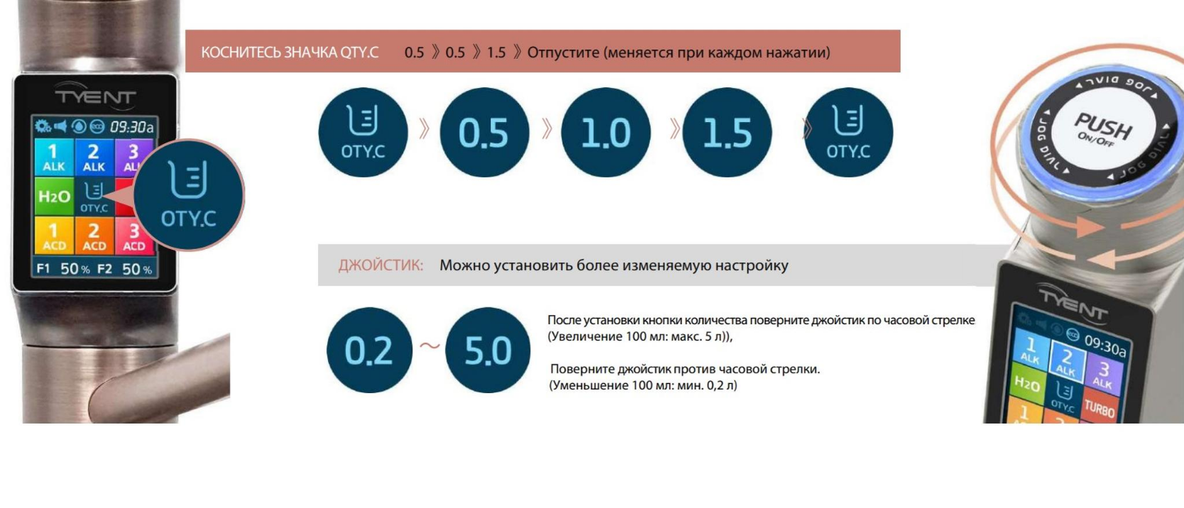 Для вашего удобства ионизатор имеет возможность дозировать заранее определенное количество воды и затем останавливаться. Пресеты включают 0,5 л, 1,0 л и 1,5 л + более точечная ручная настройка.